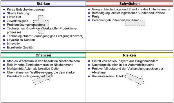 Die folgende Abbildung zeigt eine SWOT-Analyse für einen mittelgrossen Zulieferer der Automobilindustrie.